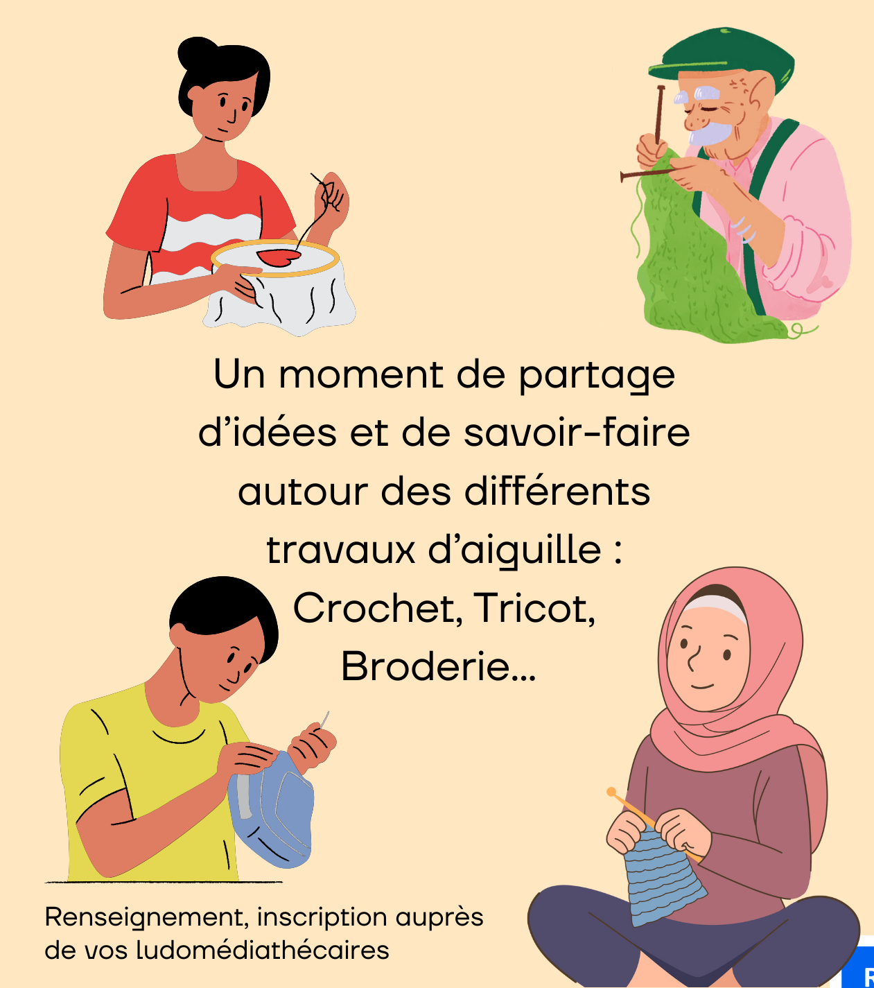 Un moment de partage d'idées et de savoir-faire autour des différents travaux d'aiguilles: Crochet, tricot, broderie...