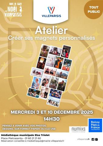 NUMIXS Lab - Labo des Créateurs "Créer ses magnets personnalisé" - mercredi 10 décembre 2025 NUMIXS Lab - Labo des Créateurs "Créer ses magnets personnalisé" - mercredi 10 décembre 2025 Du mercredi 10 décembre 2025 à 12:30 au samedi 13 décembre 2025 à 12:31 Public Familles Lieu Villeparisis - Médiathèque municipale Elsa Triolet Catégorie Atelier Tags Apprendre Découvrir Numérique NumixsLab